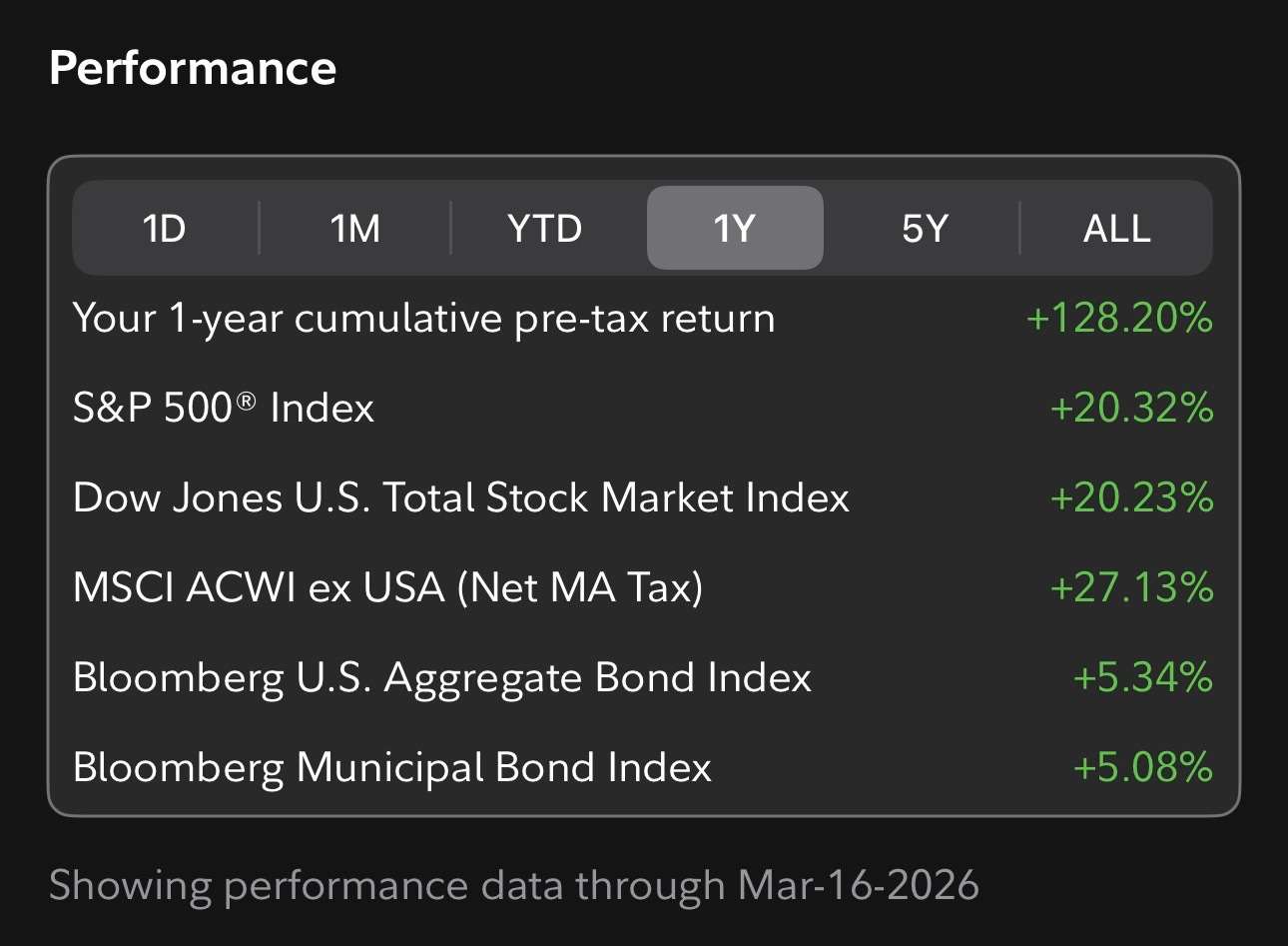 Guardian Research is up just about +40.9% year to date. The S&P 500 is down over 2% in the same period. My trailing twelve month return sits at +128.2%.